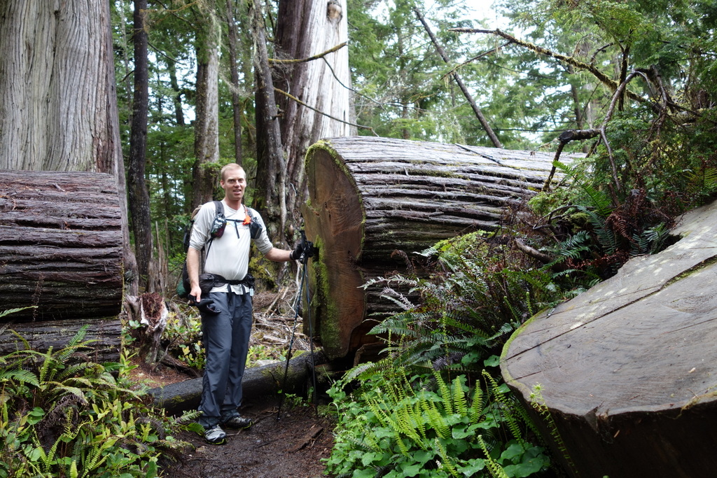 The beach comes to an end at an imposing headland, waves crashing into the weather-worn rock. I climb up a long ladder and out onto a clearing. Here, at Carmanah Point, I visit the second lighthouse on the trail. In 1896, lighthouse keeper Phil Daykin rescued nine people in a shipwreck and the lighthouse remained a refuge for survivors for many years. In fact, the WCT was built in 1907 along the route of a telegraph line to facilitate the rescue of survivors of shipwrecks along the coast. Shipwrecks are now rare but the lighthouse is still staffed and I meet Janet who takes a break from her morning weather report to point out some tricky spots on the trail ahead. It’s such a beautiful day and the views so great that it’s hard not to linger here all day. But I can’t wait for my next destination!