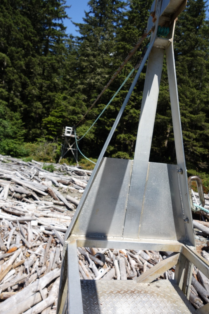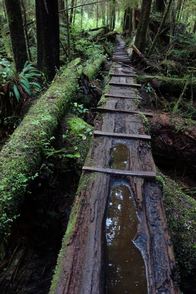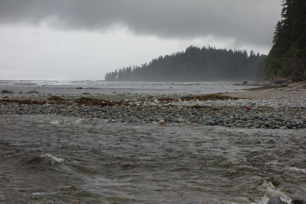 After eating my 2pm breakfast I head into the forest where the trail gets seriously rugged. Narrow slippery logs act as bridges, gnarly roots offer the only passage through bogs so deep and dark I’m afraid to step in them, and steep ladders are the sole way of getting up and down sheer ravines. Not just one ladder but tiers of them. One after the other after the other. Like climbing a multi-story building. I’m thankful for these modern additions to the trail, though. Back when the trail was used primarily to save shipwreck survivors, the trail itself was a serious survival test. The rivers had to be forded and looking at the wreathing, twisting rain forest, I can hardly imagine how anyone could get through it without a well blazed path. I climb up more ladders and pull myself across more cable cars, finally emerging at Camper Bay. I watch as the creek and incoming tide do battle, forming strange chaotic waves where the two meet.
