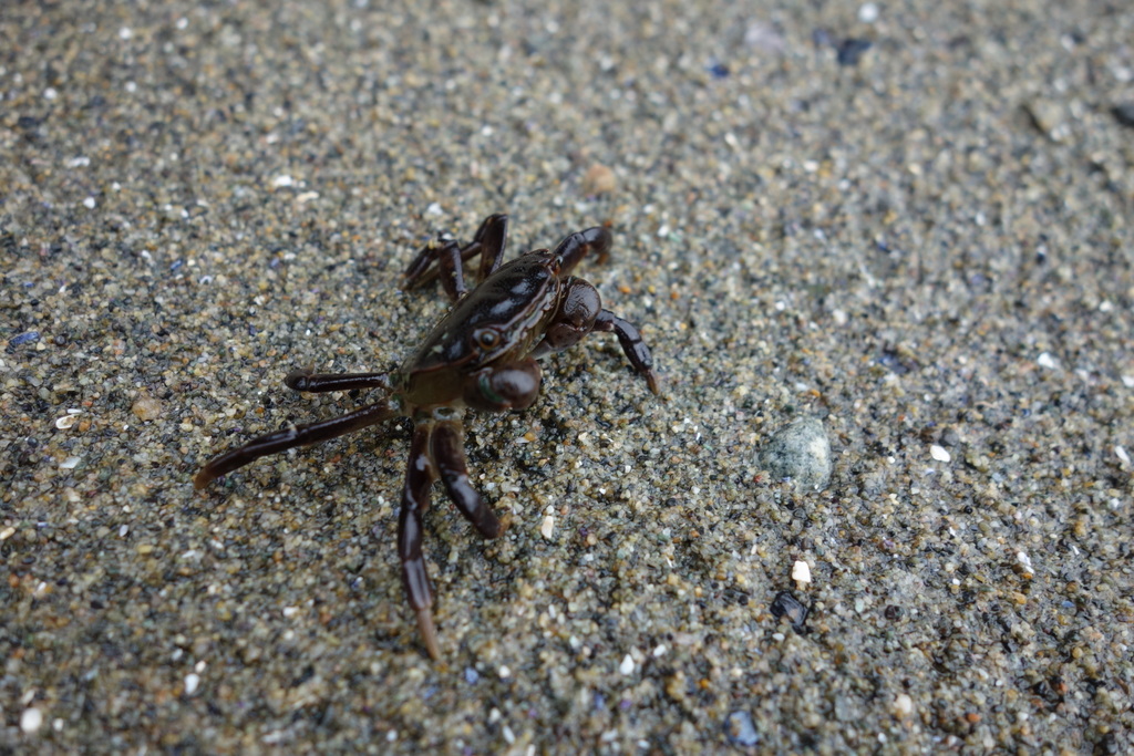 My shoes sink into the sand as I walk. You think that the beach will be easy after all that tromping through thick mud in the forest. But it’s not. Now that the sand is dry, it’s soft, and it no longer supports my footsteps. I leave behind deep depressions and feel like I’m pushing through heavy snow. It’s low tide, revealing a long stretch of flat ocean shelf. It’s smooth rock, covered in sea weed and barnacles. Steam drifts up from shallow pools of water, carrying with it fragrances of kelp and sea grass. Then an idea comes to me. My feet have been wet every moment up till this morning. What’s a little more water going to hurt? I step onto the flat rock and it’s wonderfully solid. And grippy. I move quickly, I could almost run. But I go carefully. There’s a lot of life in the inter-tidal zone and little crabs rear up at me as they sense me coming close. Some jump upright and point their pinchers at me. Others scurry away and hide under rocks. I cautiously step around all of them.