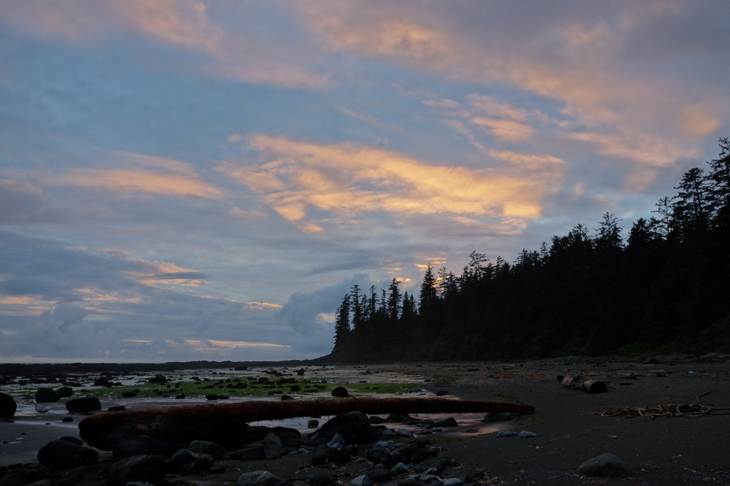 I finish my meal and head off. The rain has stopped and everything smells so fresh and wonderful. There is pine and fir in the air and every once in a while you catch the scent of the sea in the breeze. I walk for a few hours, then find a nice spot to camp on the beach beside a creek. The views are gorgeous. Waves violently crash into rock outcroppings sending foamy surf flying into the air. It’s still nice and I relax as I cook dinner and watch the sunset. It’s dark now and the wind is picking up again. I sense rain coming so I get ready for bed. As I’m getting into my tent I see a flicker of headlamps at the far end of the beach. As they get closer I see it’s the American guys. The rain starts to crash down just as I tuck into my warm sleeping bag.