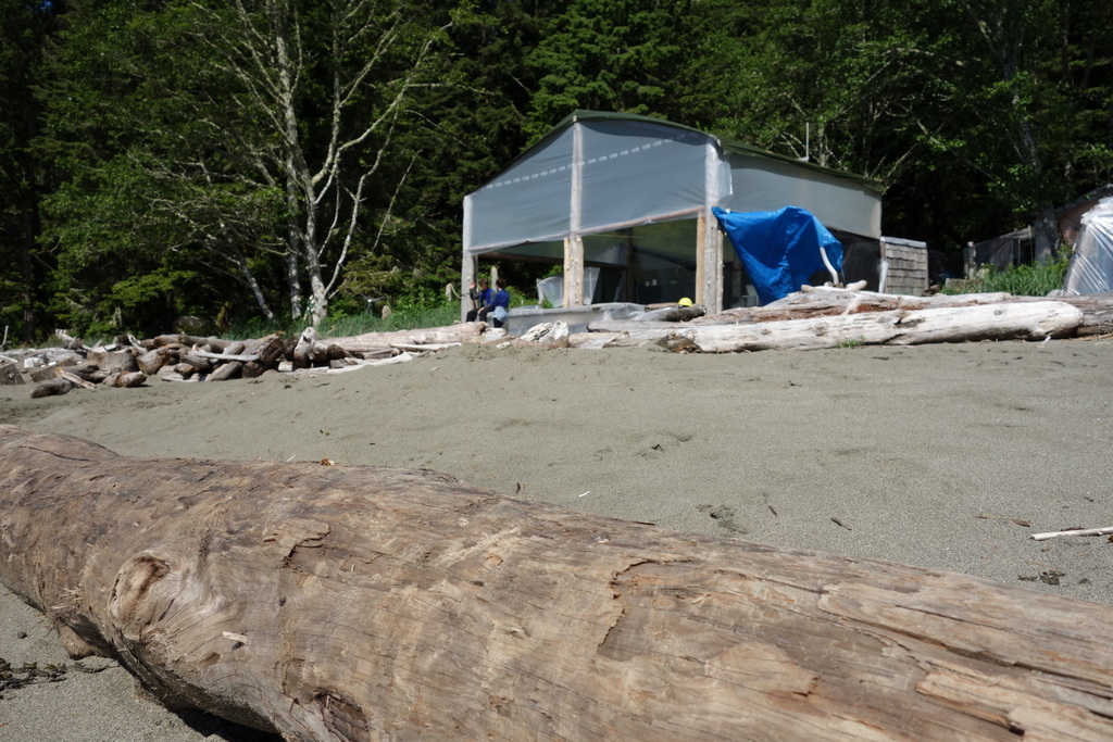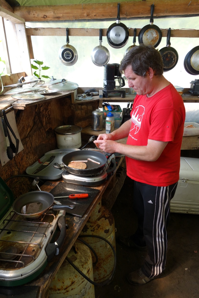 Back on the beach I spot a small red buoy suspended from a tree branch and scramble up the rocky hillside. This is the marker Janet told me to look out for. Continuing around the obvious looking bluff puts you on the edge of crumbling cliff with angry waves crashing in below. Scrambling up over the hill is much safer and puts you right where I had been hoping to end up – Chez Monique’s. Chez Monique’s is famous on the trail. Everyone you talk to raves about this little shack on the beach. It’s not the candy bars or chips or any other kind of junk food you can buy here. It’s about the BURGERS! Big juicy burgers piled with cheese and fatty bacon, fried mushrooms, tomato, lettuce, onion…! Pretty amazing considering this is in the middle of a 75 km rugged coastal trail. Mat, a portly middle-age man from Edmonton, fires up the stove and starts working on my burger. He’s working here for the summer. I sit down and chat with Monique herself. She’s 72 and still loving life in this remote camp. She tells me about her time as a computer programmer back in the days of punch-cards and the unlikely twist that brought her here. A speck of a boat appears out on the ocean and Monique yells in her French-Canadian accent, “that’s my husband!” “I can always tell it’s him. I can just sense him… Too many years together.” She laughs. Her husband is taking clients to a nearby fishing spot, one of the best in the area, she tells me. My burger is ready and even though it’s only 10am I’m starving! To be honest, anywhere else it would be a 3-star burger but here, after tromping through 45 km of knee-deep mud and racing tides to escape being trapped on some rocky outcropping, it’s a 5-star burger. I devour it.
