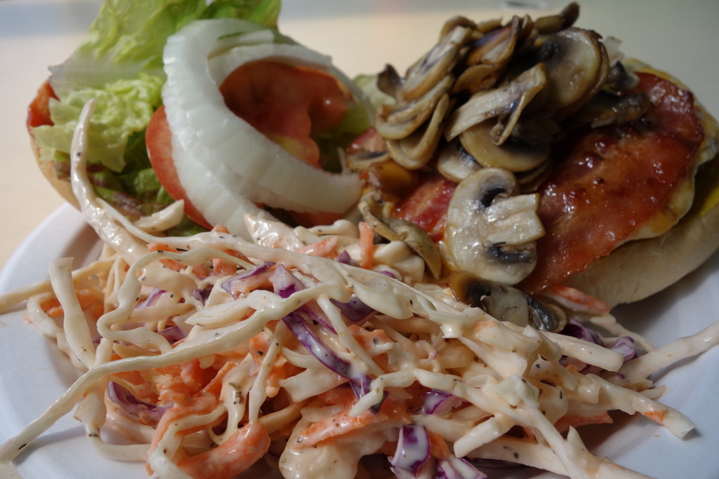 Lunch: a big burger with mushrooms, cheese, bacon, tomato, lettuce, onion, and coleslaw