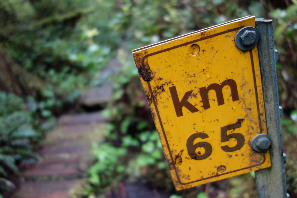 The steep ladders resume. Up up up. I go slowly, stopping on platforms between each one to rest my foot. It’s the ladders that really bug it. The trail has so much more up and down today. But I was ready for this. The cook at Chez Monique’s warmed me that the last 5 km are the hardest. I think I’ve figured out why. At km-65 I get a great idea. Wouldn’t it be fun to have a photo of each milepost, counting down the final 10 km of the trail? I start composing artistic shots. This helps me slow down and I really enjoy my surroundings. I walk on, making sure to watch out for the km-66 sign. It feels like I walk for a long ways. Then “67” appears. Did I miss it? I was pretty careful, I made sure to keep a close eye out for it. I conclude that somehow I passed it by. Then 69 is missing. Then 71! So much for my photo concept. At km-70 there is a signpost indicating only 5 km to Gordon River, the end.
