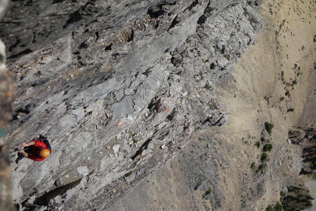 After a 4-hour hike & scramble we finally got to the base of the climb. Two other climbers were just starting. Rockfall is a serious risk and we wanted to get ahead so we combined the first two pitches into one. I’m glad we did. Passing them further up on the climb would have been really difficult.