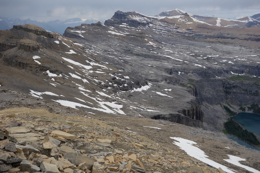 At 1pm we topped out at the summit, very happy to have made it and to have escaped lightening strikes and more rain. We were surprised when we saw two people already at the summit. They hiked up via Rockbound Lake. When Michael and I visited Rockbound in May, it was completely socked in with deep avalanching snow.