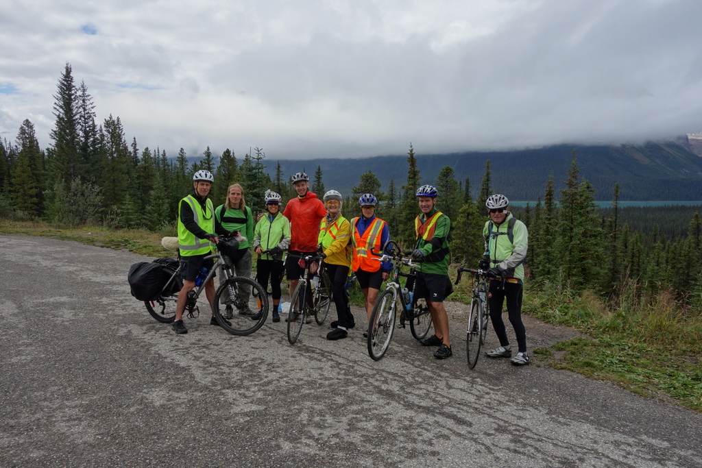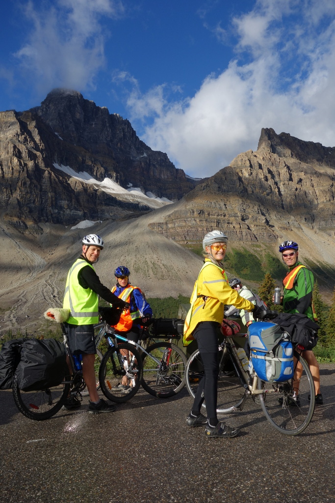 The Icefield Parkway, running from Lake Louise to Jasper, is one of the most spectacular cycle tours in the world. This road passes through a vast wilderness of pristine mountain lakes, ancient glaciers, and broad sweeping valleys. What better way to see all this than by bike! Our group of eight from the Hostel Outdoors Group enjoy the ride.