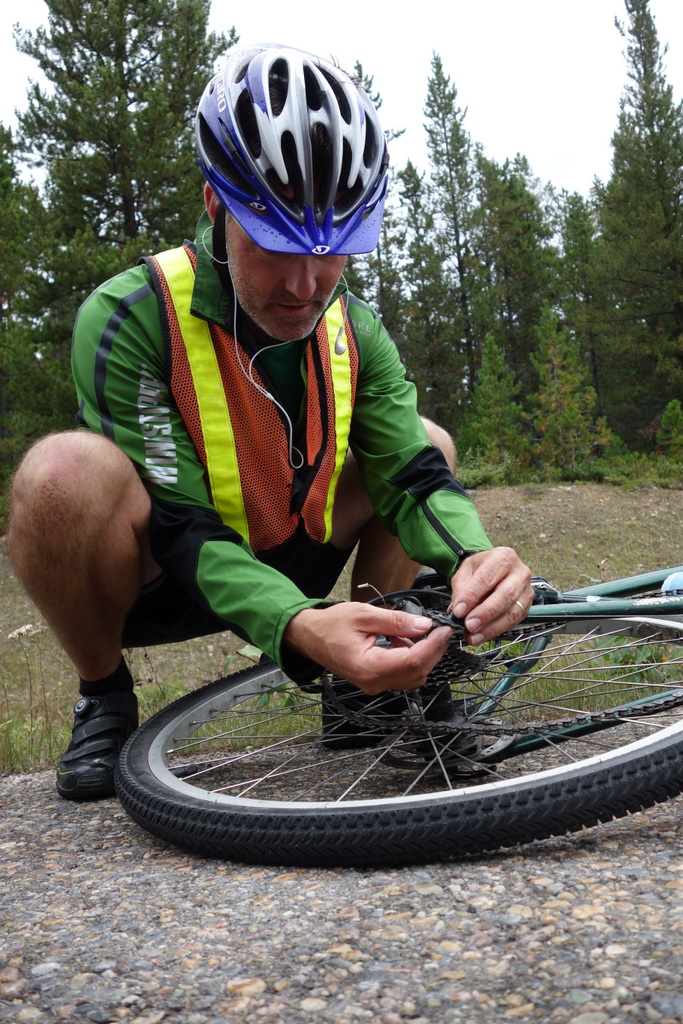 We start the day by conquering the mighty Bow Pass. It’s a tough start to the day but after a big climb yesterday, we’re already most of the way there. In fact, the road grades are pretty moderate throughout the trip. We manage to climb every hill without getting off our bikes and pushing. Quite an accomplishment for a bunch of hikers!