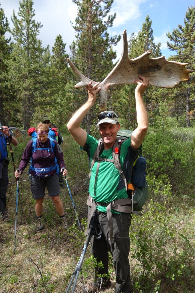 We’re all sweating as we push through hot heavy air. I estimate it’s about 40C. It’s that hot. Don’t let the snow on the distant peaks fool you. We take frequent breaks to gulp copious amounts of water. At Nigel Pass we finally encounter a few scrawny patches of snow. Just a week earlier I’d run into knee-deep snow at this same elevation. How fast conditions change. Spring in the Rockies.