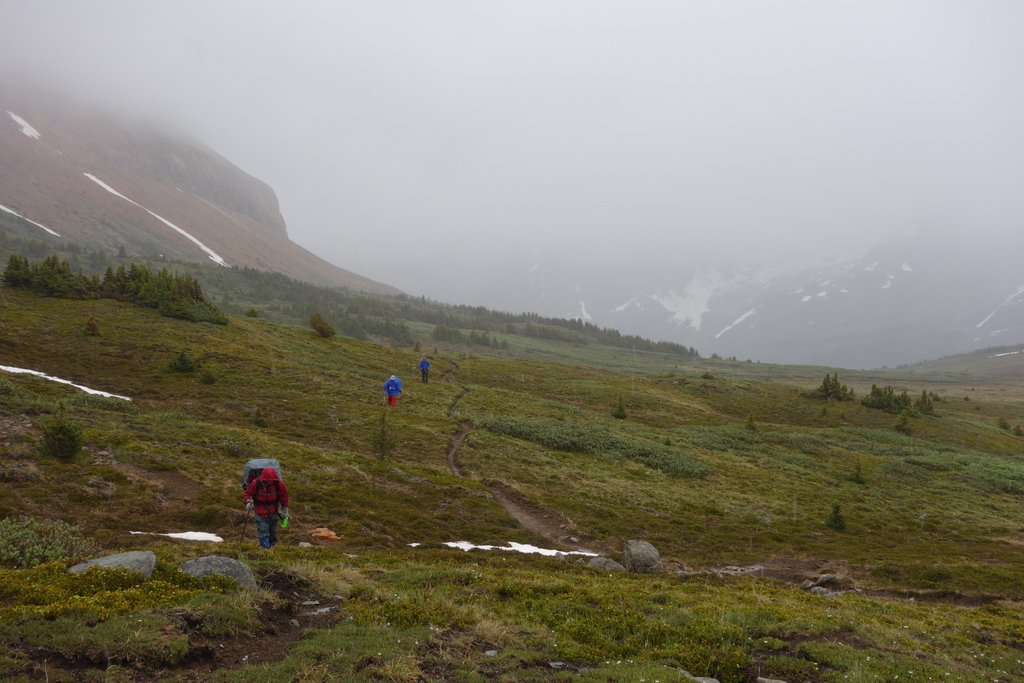 It’s a big climb up Poboktan Pass. But this is why we came. Big views. Wild country. Soon fog rolls in and it starts to rain. But, you know, it’s just as beautiful this way. Delicate wildflowers peek out from streaks of melting snow. Everything is green, everything is fresh. We all stop and soak it in.