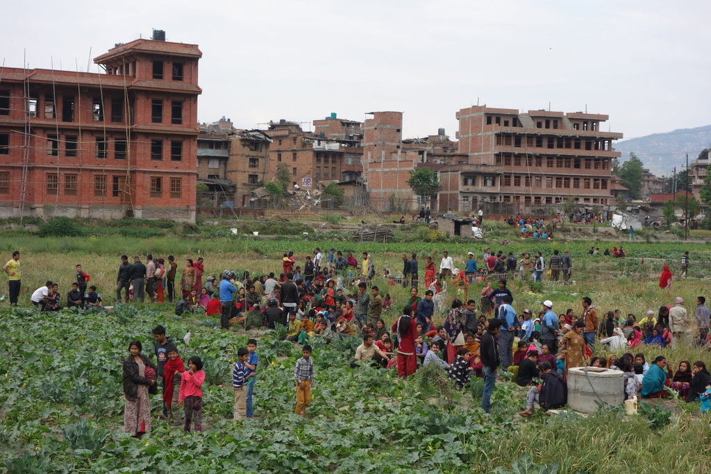 We stepped out into the street and were shocked at the damage. Piles of broken bricks littered the street. Sheet metal roofing was thrown to the ground, bent and twisted. Broken wires hung low, blocking safe passage. We were very lucky that one section of the street was relatively clear and we were able to get past the debris into an open area. Bhaktapur has a lot of agricultural area mixed in with the city and it was one of these large cabbage patches were we saw a lot of people gathering.