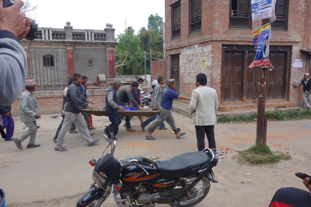 Despite Charles’ shocking appearance, he had no signs of concussion. He was in some pain but completely aware of his surroundings and still in good spirits. The local Nepali people weren’t convinced. In one moment they urged us to go to the hospital and, in the next, to stay put in the open. For the moment, we chose to stay in the open, bracing for aftershocks. We managed to find some running water and cleaned up Charles’ head. Already, the spot where the brick hit was quite swollen. My elbow had also swollen up and I’d lost the ability to bend my arm, although I could still wiggle my fingers.