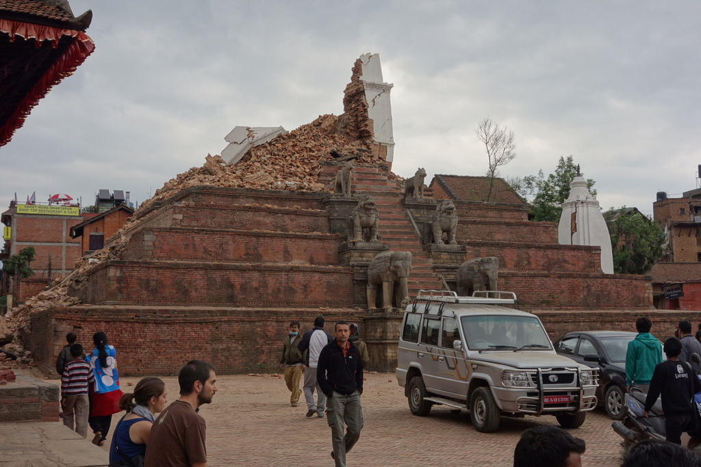 Returning to the guesthouse, we packed up our bags and found our way to Durbar Square, the historic and cultural center of Bhaktapur. Amazingly, the damage was more limited here. One monument was completely destroyed, others cracked or partially crumbling. But the buildings were all relatively intact. This is the first place we encountered any fellow tourists. Those who were in the square when the quake hit were ok. They reported that a large bell located near the center of the square had started swinging wildly and that roof tiles started to break free but that everyone was ok.