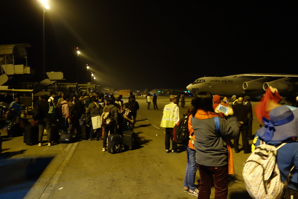 We returned to the airport as it got dark and continued to wait. Flight after flight was cancelled and we were prepared to try to find a guesthouse or to camp out in the open. Well-equipped tourists on trekking holidays set up tents in the airport parking lot. Against all odds, security let those on our flight and two others into the airport. We all moved through the building and out onto the tarmac. Even though we didn’t see any signs of damage, there was too much risk of aftershocks to stay inside. I’ve never in my life seen a runway full of hundreds of people as planes roar in and land and I’ve never heard such cheers either.