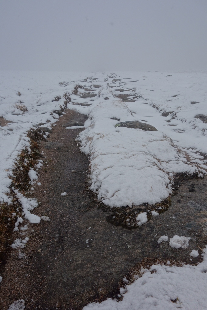 At first the snow melted on contact with the ground (and me), then it started to stick. As I reached the top of the munro, the snow was settling 3-5 inches deep in spots and beginning to obscure the trail.