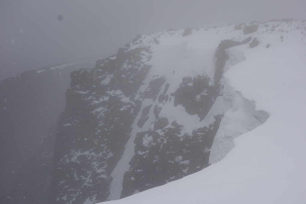 But as I dropped down from the summit, the clouds seemed to lift a bit and rewarded me with fantastic views down to Loch Nagar (the lake, rather than the mountain, in this case). Steep snow chutes plummeted straight down the cliffs just feet in front of me. It looked like winter.
