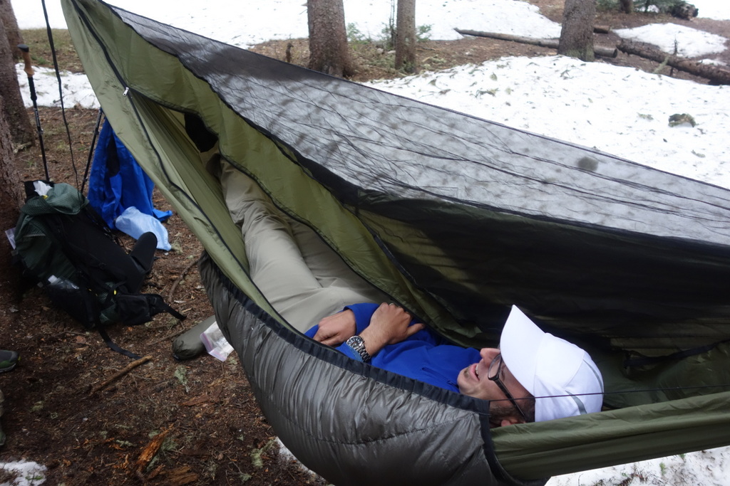 We met at the trailhead where Andrew and Brian handed out food and demo gear. Being able to try new shelters, sleeping bags, and backpacks is a nice perk of Andrew’s trips. Half the group went with hammock sleeping systems. I chose a Solomid, the same storm-proof shelter that Andrew took on his Alaska-Yukon expedition.