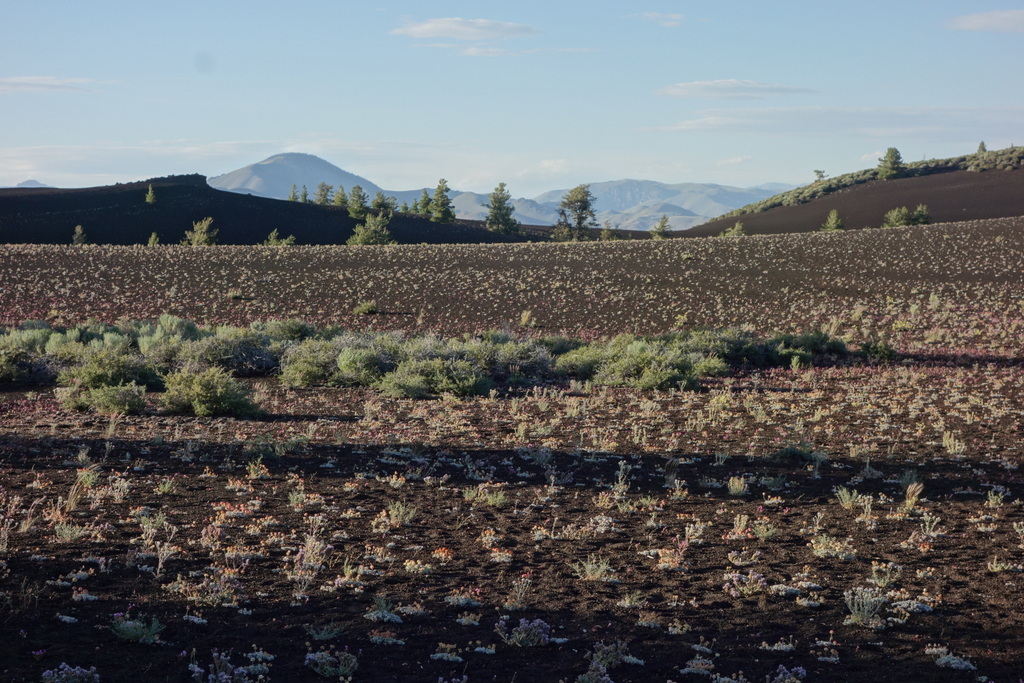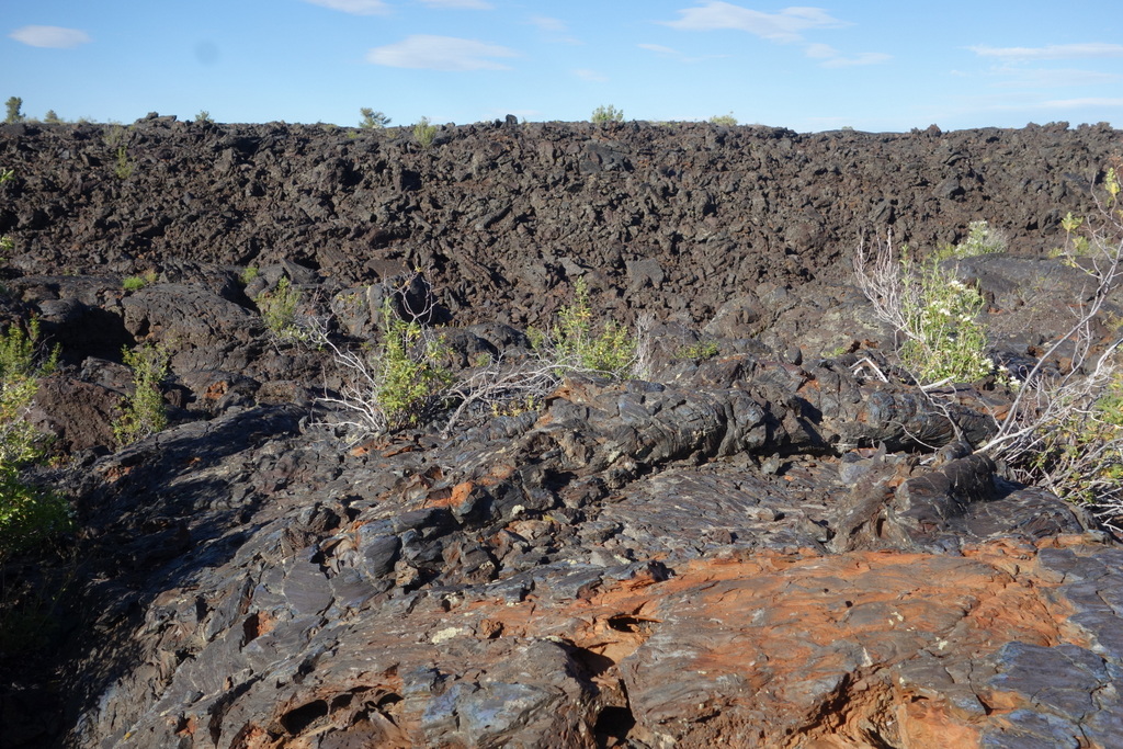 Craters of the Moon is a little-known, seldom-visited lava field in southern Idaho. Sil and I had the chance to visit earlier this week on our way from Colorado to Vancouver Island. The scenery really is other-worldly. Oozing lava weaves its way through the landscape like a giant snake. Huge tubes and bubbles of lava cooled then dramatically shattered leaving behind a chaotic mess of sharp blocks. Spatter cones are caught frozen in time, as if caught in the action of spewing out molten rock for an eternity. It feels like a desert – hot, dry, intense burning sun. Temperatures regularly soar to 110F in summer and the surface of the blackened lava can reach 150F! And yet, just below the surface are a series of cool caves formed by “lava tunnels”. Scrambling down into one of these caves brings instant relief from the heat of the day and urges you to explore deeper. We found one that even had ice covering the walls and cold water dripping from the ceiling!