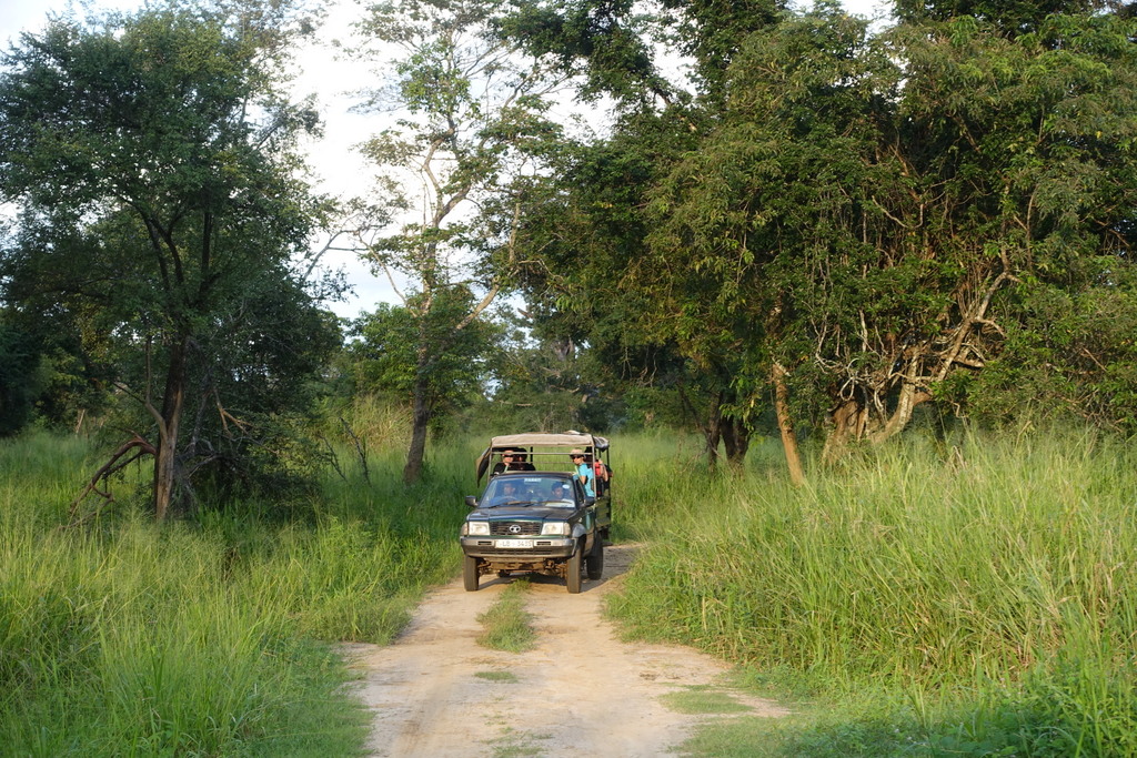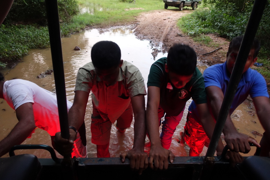 Sri Lankan roads are pretty rough in general but particularly so in Wasgamuwa. Our jeep rumbled over big bumps and sloshed through mud without too much trouble. As daylight started to fade we turned around to return to the park entrance. Our driver stopped at a particularly large mud bog and told everyone to hold tight. He gunned it, crashing and careening into the deep gunk. The jeep suddenly halted – in the middle of the quagmire. We were stuck.