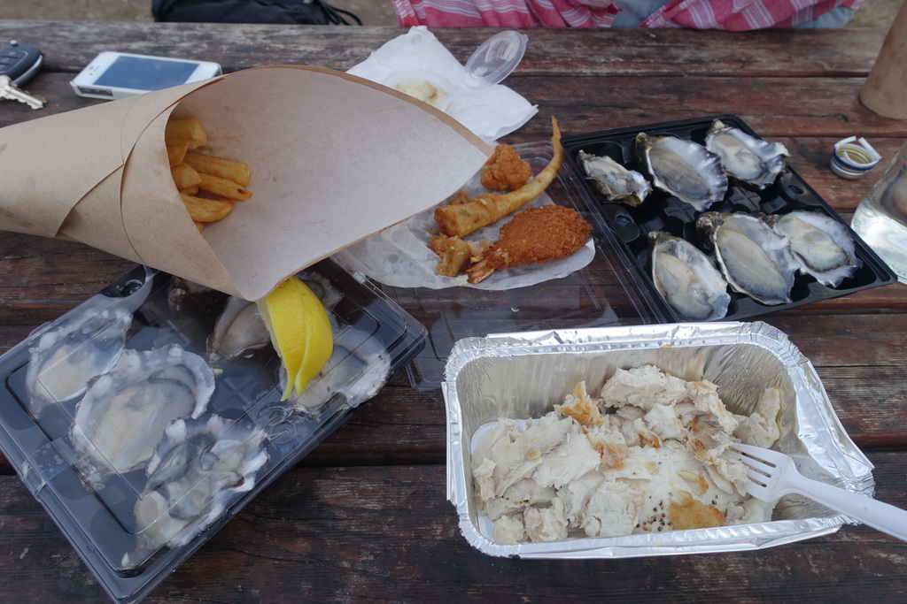 It seemed like everyone in little Triabunna was enjoying dinner at the fish truck, so I joined in. Fresh fish and oysters? What a great way to finish a day of cycling.