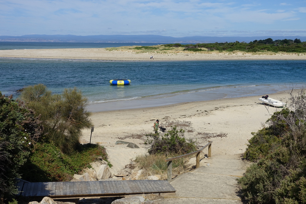 I really wanted to catch a boat across the narrow channel of water that splits the Freycinet peninsula from a place called Nine Mile Beach — who wouldn’t want to visit a place with a name like that! I stopped off at Kent’s house and inquired about catching a ride. He used to take cyclists across but it turns out that he sold his boat a few years ago. That’s too bad. Fortunately, Sil is driving, so we just put the bike in the car and she drove me up to the Coles Bay junction so that I wouldn’t have to repeat that section of road.