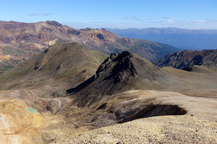 Once we reached the ridge crest Jim instantly forgave me. What amazing views! The intense red, yellow, and orange colours – like fire – of the ridges around us flowed down to the distant giants of the Coast Range, covered in their massive glaciers.
