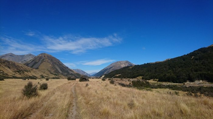 Now that we’re beyond Arthur’s Pass, the scenery is completely different. We’ve gone from the wet west side of the continental divide to the much drier east side. The walking was flat, across river beds and through fields, and under volcanic looking hills.