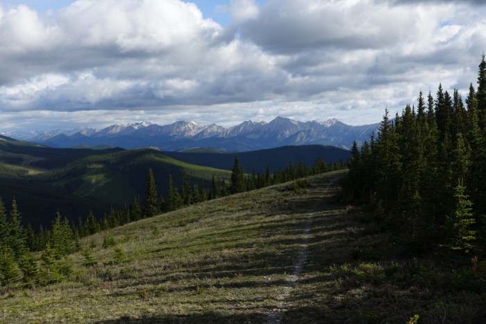 The trail runs along open exposed ridges with great views of the continental divide just one short valley over. A cold morning wind cut through me as I walked quickly along these ridges, stealing views when the wind let me. The Kananaskis peaks appeared in the distance, giving me a feeling of familiarity and reassurance.