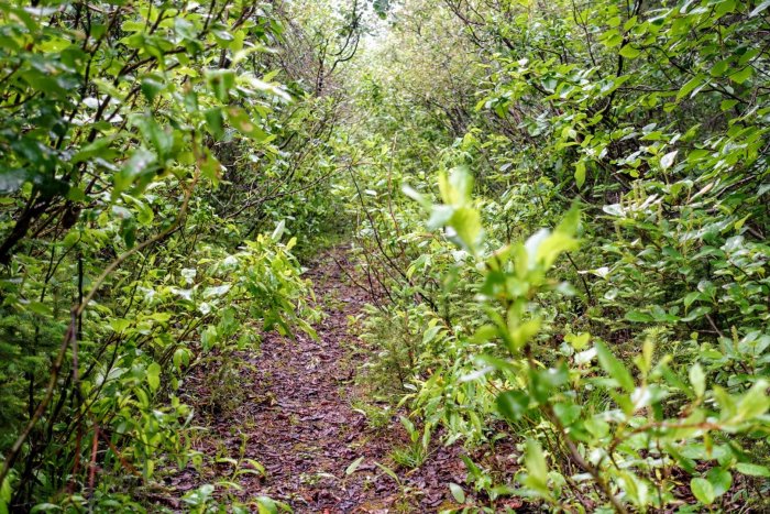 Well, it hasn’t been a terrible day by any means but the scenery has mostly consisted of bushes right in front of my face. It’s been raining lightly and all the leaves are loaded with water. I got too hot wearing my rain gear, so I gave up and just got soaked. Somehow, I actually enjoy it.
