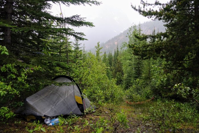 Amiskwi Pass felt like a whole different world from the car wash bushes below. The sun came out, so I spread my tent over some bushes to dry and took a nice little nap.