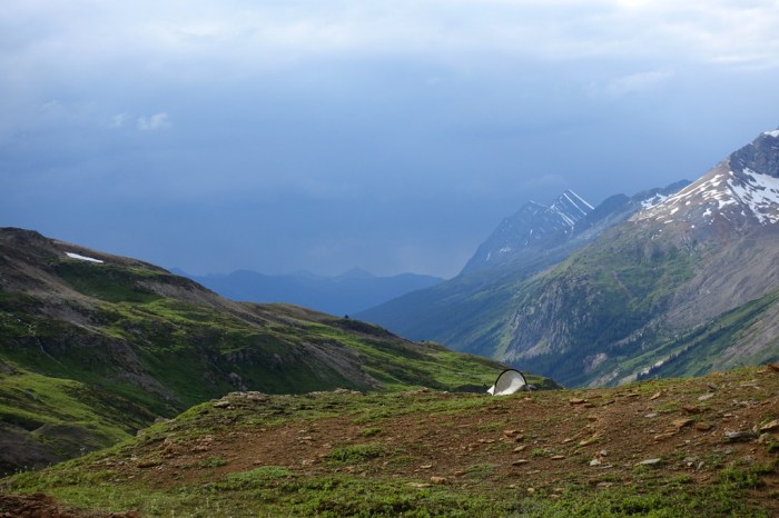 Tomorrow I have to do the most notorious river ford on the whole GDT: glacial Smoky River. Logically, I should try to get as close to that crossing as possible tonight so I can attempt the ford first thing in the morning. The author of the GDT app notes that it is “likely to be too high to cross at any time save for very early morning” and that trying to cross further upstream “is certainly suicide”. Despite all those considerations, though, Moose Pass is just such a beautiful place that I really wanted to spend the night there. Experience over practicalities.