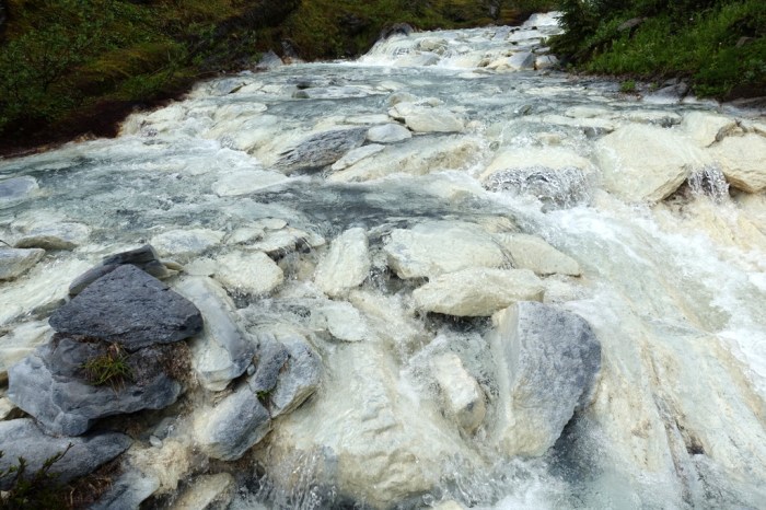 The next morning I set off in the gloomy rain, following a creek coated in a very strange sediment that made it look like it was flowing out of a cement plant.