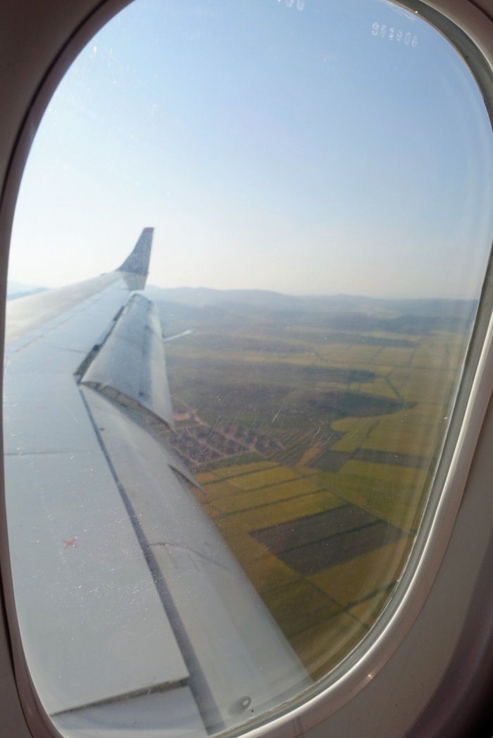 Flying over fields of rice and little villages, we soon landed in Pyongyang.