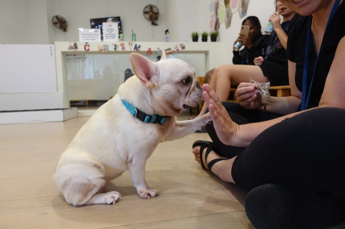 Admission of roughly $10 includes a drink but treats are extra. $3 might seem a bit expensive for such a little bag of treats but it’s probably a good idea, given how quickly the dogs gobble them up. Actually, these dogs are very food-motivated. The corgi knows all the tricks, like how to sneak up and grab a treat when you’re not looking. But she’ll also cuddle with you for a few minutes if she thinks you might have one.