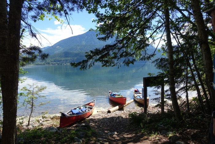 There are eight campgrounds along the west shore of the lake, seven in the park proper. The campground furthest to the north is outside the park and accessible by road, so you might end up sharing with lots of other people. We chose the next campground, Wee Sandy Creek, and couldn’t have been happier. Due to the raging creek flowing right next to the campsite, it was “air conditioned”, even in the heat of the day.