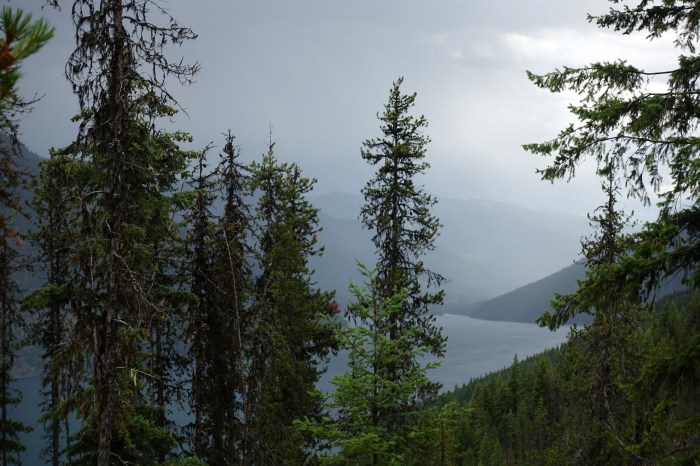 Mientras volvía al Lago de Slocan por el sendero, llegó una tormenta con nubes oscuras y truenos ruidosos. ¡Por fin! Me encantan las tormentas. Llegué a la cabaña justo cuando comenzó a llover. ¡Qué suerte!
