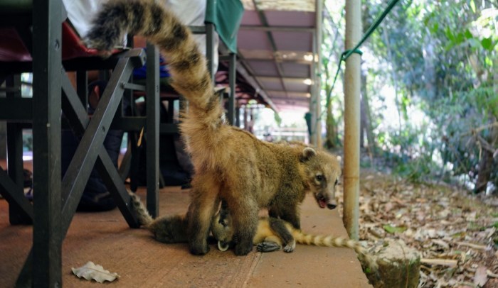 Al ser la selva, esperaba ver animales salvajes. Resulta que algunos de esos animales no son tan tímidos como esperaba. Esta coatí, por ejemplo, está enseñando a sus crías a mendigar (más bien robar) comida a los humanos.