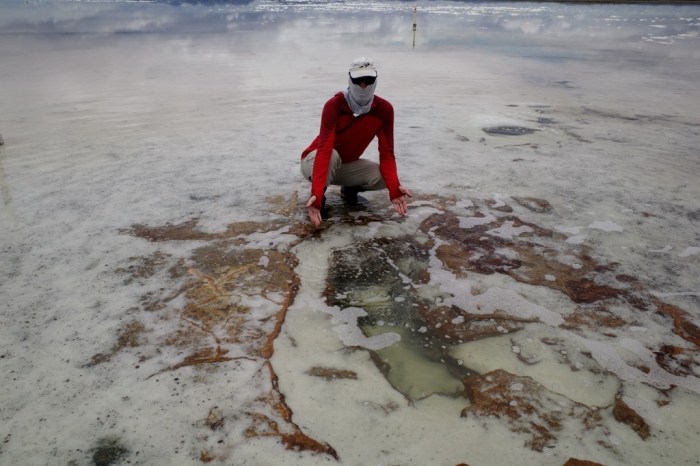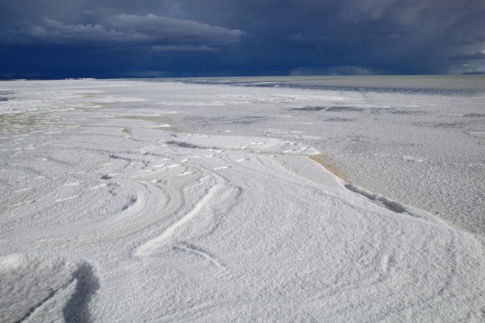 – Cristales de sal se forman al borde del salar. Más allá, el salar tiene una profundidad constante de unos 30 cm