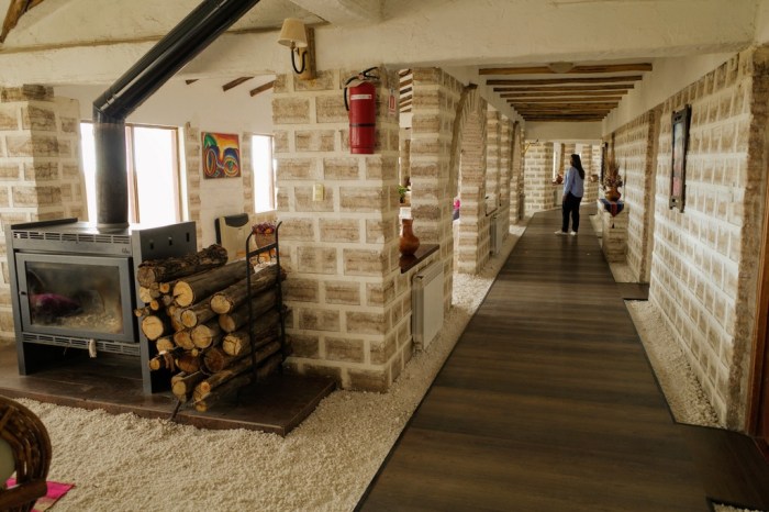 So, what do we with all of that salt anyway? Well, beyond sprinkling it on your french fries, you can cut it into blocks. More precisely, over time, heat and pressure compress the salt crystals into rock and you can cut that rock into perfectly-shaped blocks. That’s how Hotel Luna Salada was built. Yep, the hotel is pure salt rock.