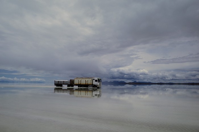 In this photo you can see a truck hauling salt. At first, I thought it was really strange to drive across the salt flat when it’s covered with a foot of water. It turns out that it’s actually easier to do that than it is to risk your life on the terrible “roads” that go around the salt flat. Under that water, it is a “flat” after all.