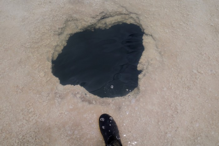 When I thought that it was crazy to drive a heavy truck loaded with wet salt across the flats, I wasn’t totally wrong. It turns out that there are holes under the water. In Spanish they’re called “ojos”, or eyes. I thought the salt flat was solid but it’s more like a glacier, replete with cracks, gashes, and holes. Better drive with care.