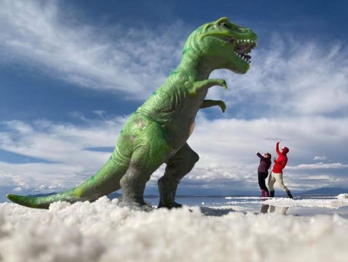 El Salar de Uyuni es el sitio más visitado de Bolivia entre los turistas porque el espejo hace posible tomar fotos muy divertidas. Tuvimos mucha suerte de tener exactamente la cantidad justa de agua en el salar para hacer el reflejo posible. Si el agua es demasiado profunda, el viento forma olas en la superficie, que distorsiona el espejo.